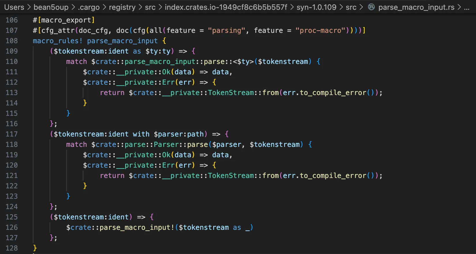 The generated impl blocks can be inspected using the cargo-expand plugin. Since it is just a wrapper command, the same result can be obtained with cargo rustc --profile=check -- -Zunpretty=expanded: match works like a switch–case, but doesn't iterating over enum variants with if statements during deserialization make match kind of pointless...?